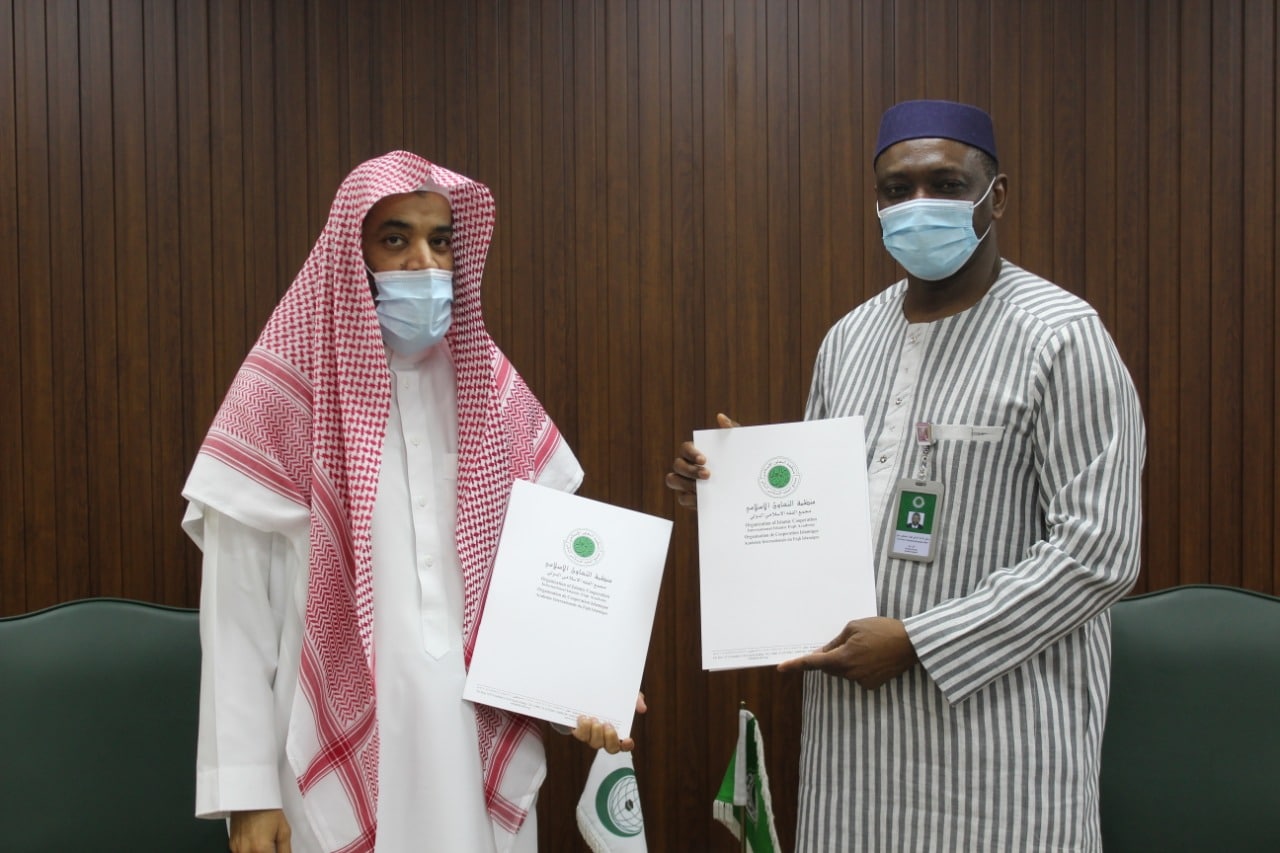 H.E. Prof. Koutoub Sano, Secretary General of IIFA and H.E. Dr. Khaled bin Abdullah Al-Suraihi, Director General of MEDAD (International Center for Research and Studies) signed a cooperation agreement at the headquarters of the Secretariat General of the Academy on Tuesday morning, 20 Shawal 1442, corresponding to 1 June 2021.