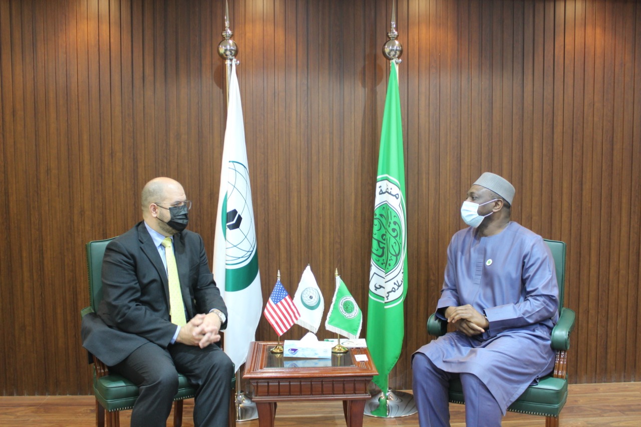H.E. Mr. Ryan Gliha, Consul General and Special Envoy of the United States of America to the Organization of Islamic Cooperation, accompanied by H.E. Mrs. Kholoud Kandil, Deputy Director of the Political and Economic Department of the Consulate, paid a courtesy visit to H.E. Prof. Koutoub Moustapha Sano, Secretary General of the Academy, on Thursday 21 Dhul al-Quidah 1442 corresponding to 1 July 2021, at the Academy’s headquarters in Jeddah.