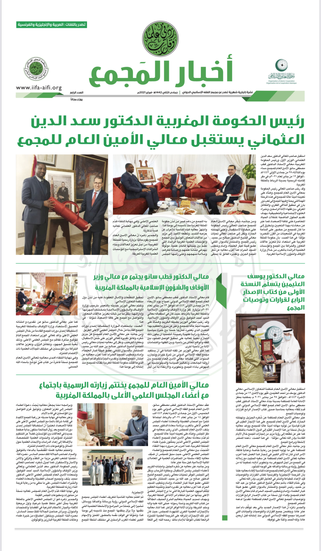 Ce numéro comprend un compte-rendu de la visite officielle du Secrétaire Général de l’Académie au cours de janvier au Royaume du Maroc, de ses rencontres avec les plus haut responsables du gouvernement marocain tels que le Premier Ministre, le Ministre des Habous et des Affaires Islamiques, et les membres du Conseil Scientifique Suprême. Le numéro comprend également la déclaration finale et les recommandations émises par le premier forum scientifique entre l’Académie et les Conseils de Charia des Banques et Institutions Financières Islamiques au sein des pays du Conseil de Coopération du Golfe, ainsi que d’autres nouvelles importantes.